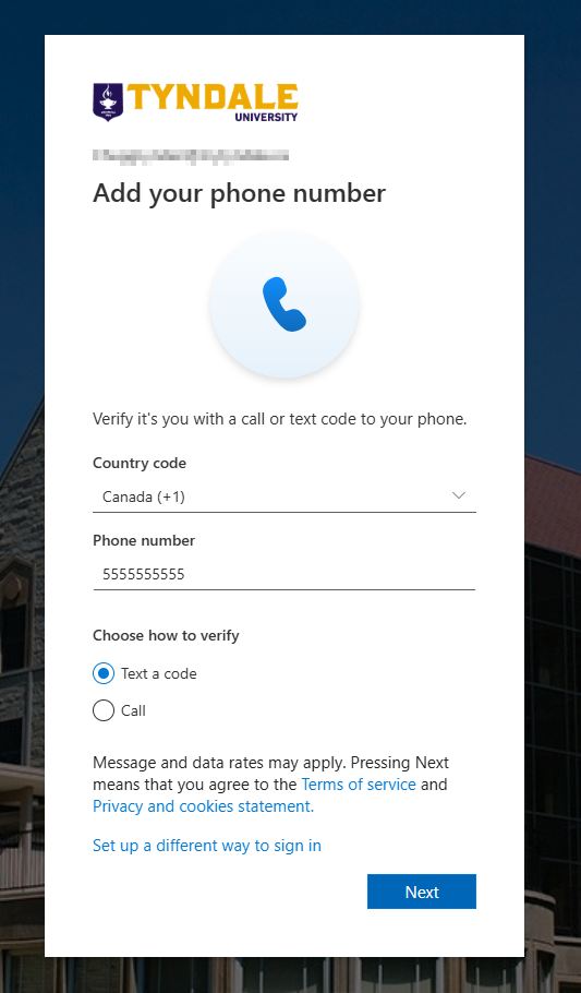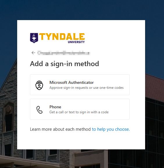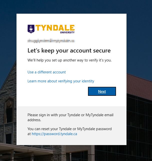 1. Visit https://aka.ms/mfasetup in a web browser on your computer and sign in using your Tyndale email address and password. This Microsoft link provides a direct entry to your Tyndale or MyTyndale account security settings. If you do not know what your account password is, please visit https://password.tyndale.ca and you can request a password reset email be sent to your personal email account.
