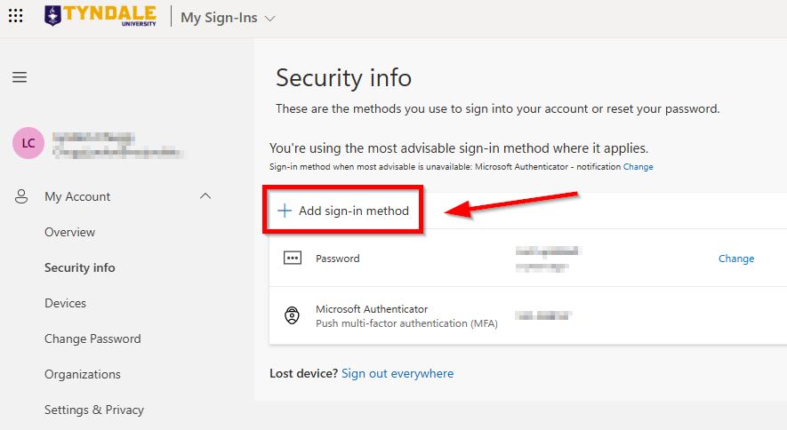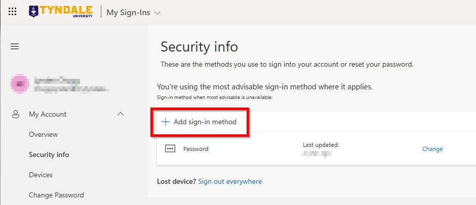 1. On a computer or laptop, please visit https://aka.ms/mfasetup and sign in with your Tyndale or MyTyndale email address. You will be directed to the "Security info" webpage below. Click on "Add sign-in method"