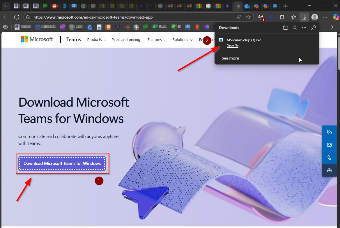1. in your browser navigate to microsoft.com/en-ca/microsoft-teams/download-app and select Download Teams for Windows. For Mac users, the button will say "Download for Mac" instead.
