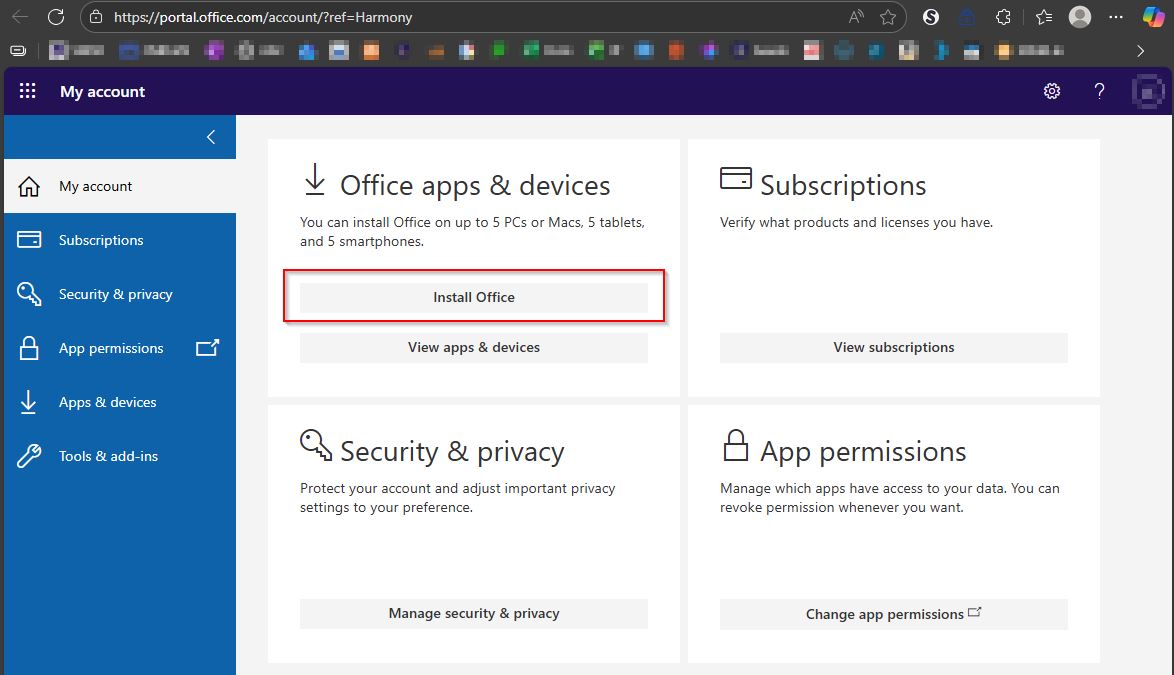 5. Click Install Office as indicated, and you will have a file start downloading on your computer. It can be located in your Downloads folder. Once it's completed downloading open the file to start installing your copy of Microsoft 365. Once it's installed you will likely be prompted to login with your MyTyndale student account again to activate your copy.